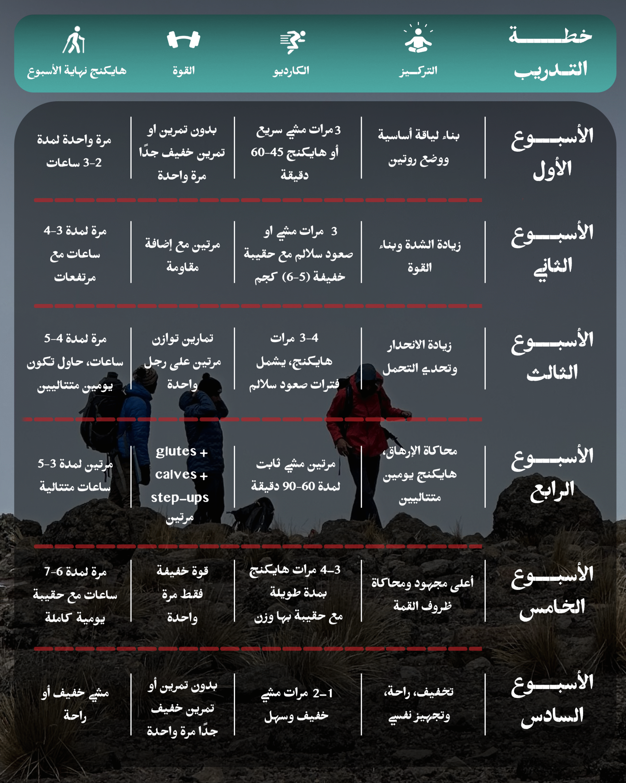 الخطة المعروضة تعتمد على المشي، وتدرّج الجهد، وتمارين أساسية تقدر تسويها بأي مكان بدون أدوات. وهي مبنية على تجارب حقيقية من مشاركين واجهوا القمة ووصلوا لها، عشان تكون الصورة واضحة قدّامك قبل ما تبدأ تدريبك.